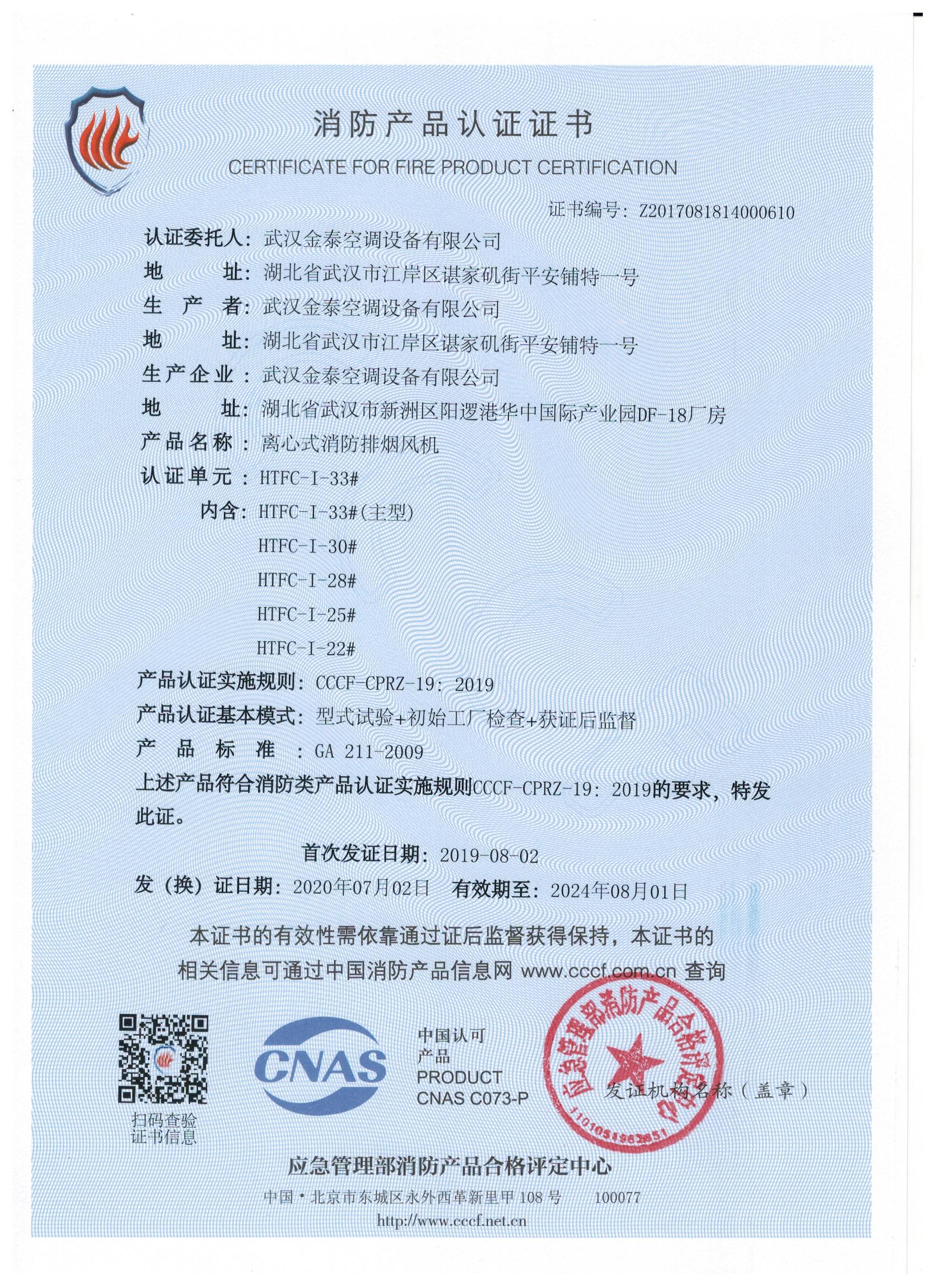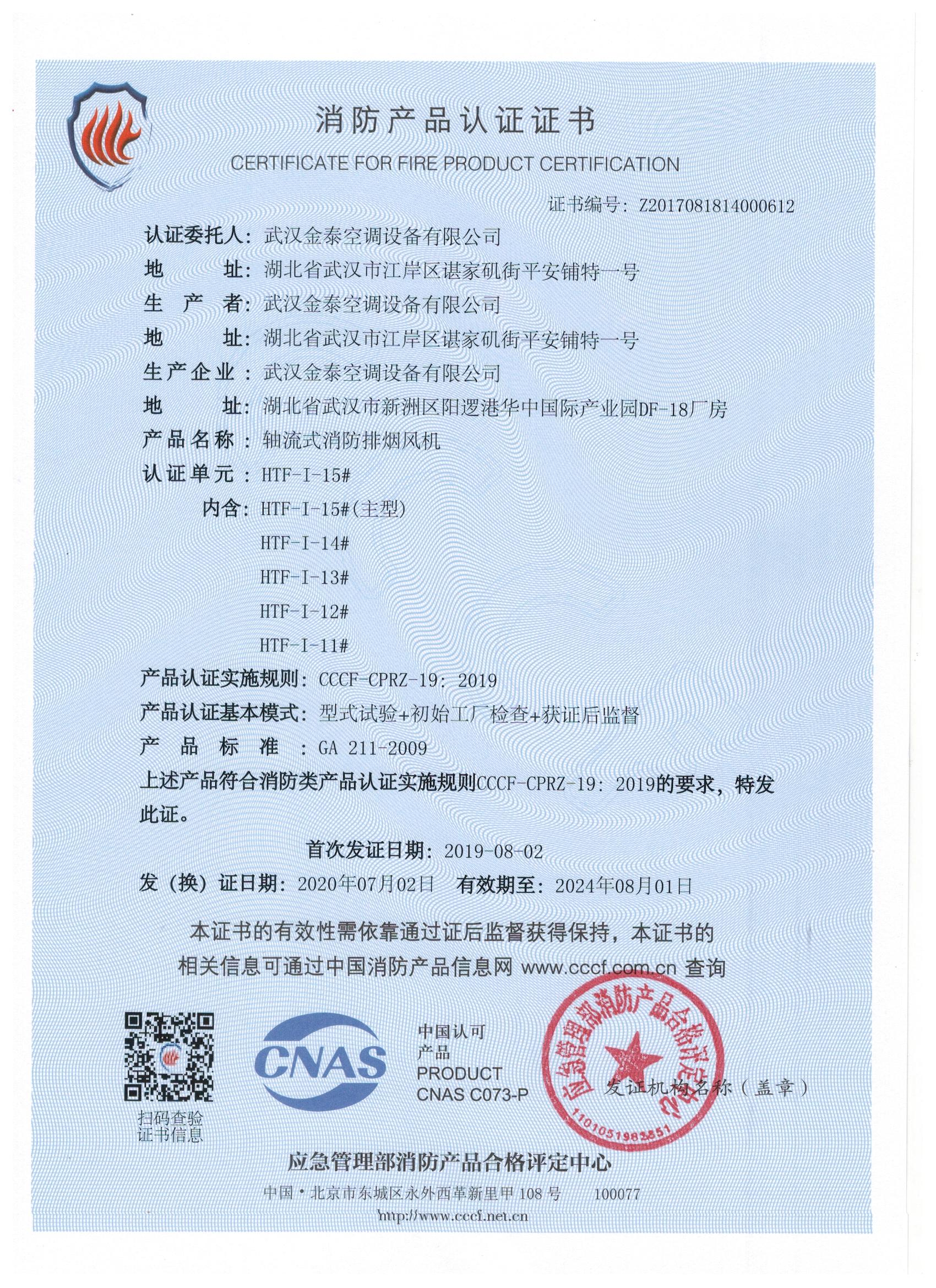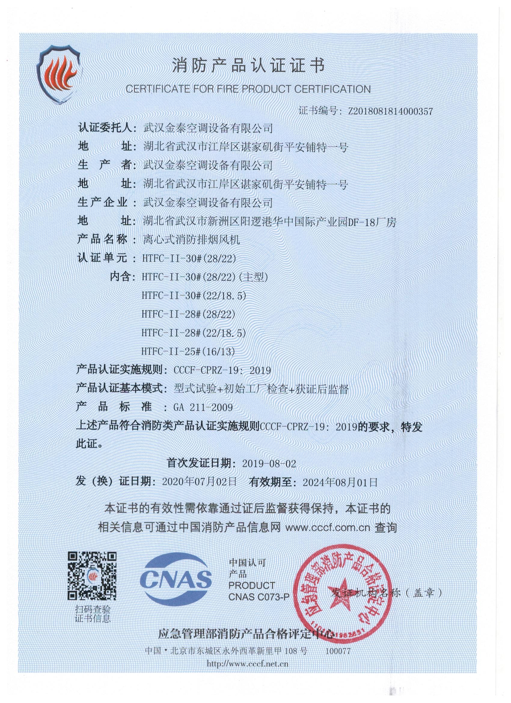 武漢金泰空調(diào)設(shè)備有限公司 是國內(nèi)長期專注于民用風機、工業(yè)風機領(lǐng)域的標桿企業(yè):專業(yè)生產(chǎn)消防排煙風機系列、排煙防火閥系列、一般通風機系列(軸流式、離心式、屋頂式、壁式、隧道式、射流式)、風口、風管等消防及通風設(shè)備。產(chǎn)品經(jīng)公安部消防產(chǎn)品合格評定中心評定符合消防產(chǎn)品CCC標準;經(jīng)中國合格評定國家認可委員會認證的檢驗所檢驗合格;經(jīng)國家防火建材質(zhì)量監(jiān)督檢驗中心(四川中心)火燒實驗,耐火性能達標。